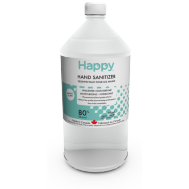 Refill your small spray bottles with the new 950ml refill format. Happy is an extraordinarily moisturizing sanitizer formulated to help keep the skin soft and supple without the need for lotions or creams. It's like a sanitizer and moisturizer in one! Alcohol-based made only from pharmaceutical grade or food grade ethanol. Made in small batches in Canada.